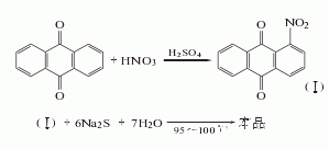 1.硝化還原法 蒽醌經(jīng)混酸硝化得硝基蒽醌,反應(yīng)產(chǎn)物過(guò)濾并用熱水洗至中性后,用亞鈉精制。其中2-硝基蒽醌與亞鈉生成易溶于水的蒽醌-2-磺酸鈉,過(guò)濾后洗滌除去之。所得1-硝基蒽醌用硫化鈉還原得1-氨基蒽醌粗品,經(jīng)加堿液、保險(xiǎn)粉精制除去二氨基蒽醌后再用氧氣氧化、過(guò)濾、干燥,得成品。