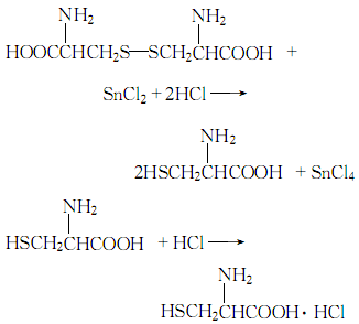 1.將胱氨酸溶于稀鹽酸中,過濾加入錫粒升溫回流。將還原液用水稀釋,移去剩余錫粒,通過硫化氫使飽和,過濾,濾渣用少量水洗,將洗液、濾液合并,減壓濃縮,冷卻結晶,干燥得鹽酸l-半胱氨酸。